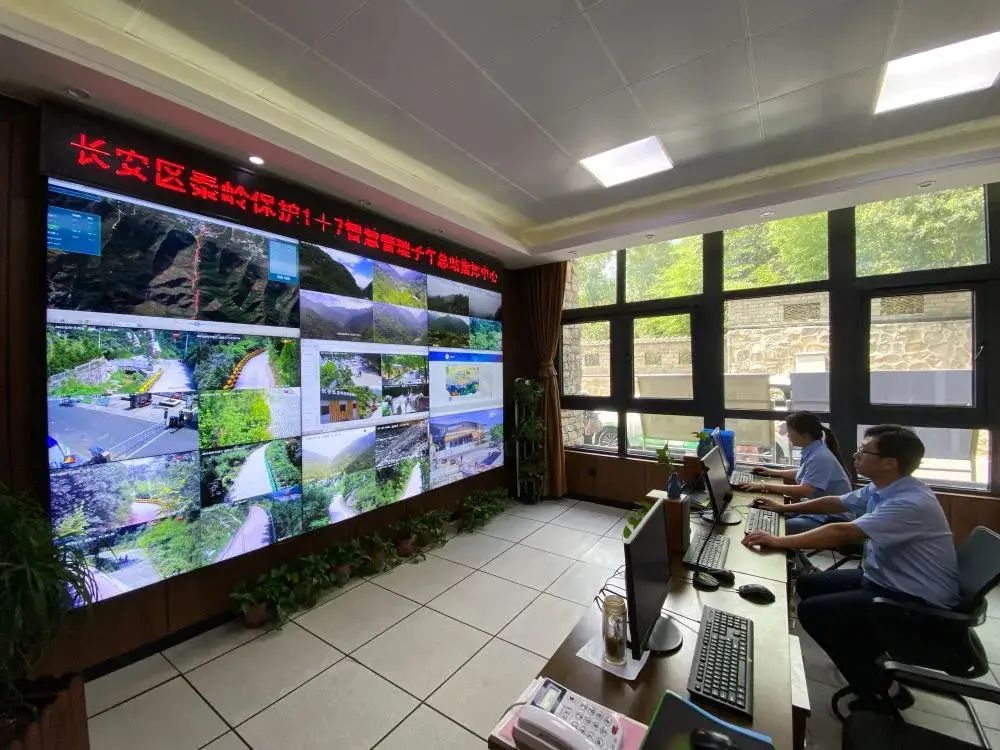 工作人员在西安市长安区秦岭子午峪保护总站内查看监控画面等信息