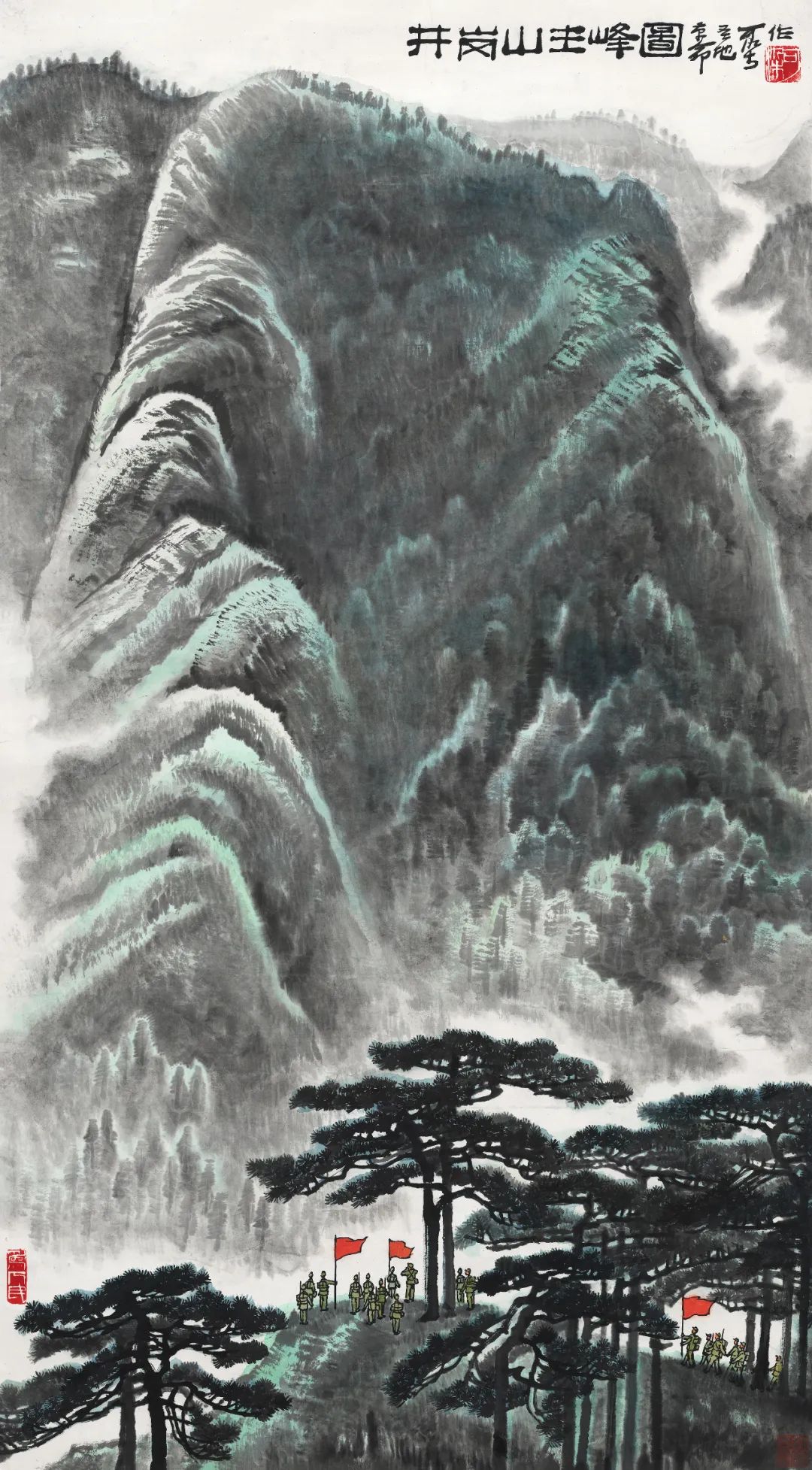 《万山红遍》是李可染的代表作之一,是他的典型风格和画法。作品取毛泽东《沁园春·长沙》之词意,画面构图饱满,气势雄壮豪迈。1964年创作此画时,正处于李可染大量写生后的理性思索时期,他逐渐走向创作的巅峰状态。这幅作品没有简单图解伟人诗词,而把图像的写实描绘变为抒情性的写意表现。经营布局极具气势,以墨作底,朱砂色铺陈整个画面,不同凡响之处便是满目的“红山”,简直红到骨髓,强调“遍”字,并将其推向极致,意境非凡。在他之前,没有人这样画过,可谓大胆创新之举,画面虽红艳,但由于以墨色铺底,并不火气,滋润明亮又富有层次变化,且有景深空间。既有严谨的刻意经营,又不失情感的自然流露,开创了当代山水画独树一帜的艺术风貌和现代性的形式感受。让我们耳目一新,同时代的画家有多人画过同样题材,但均不及李可染的这一幅。