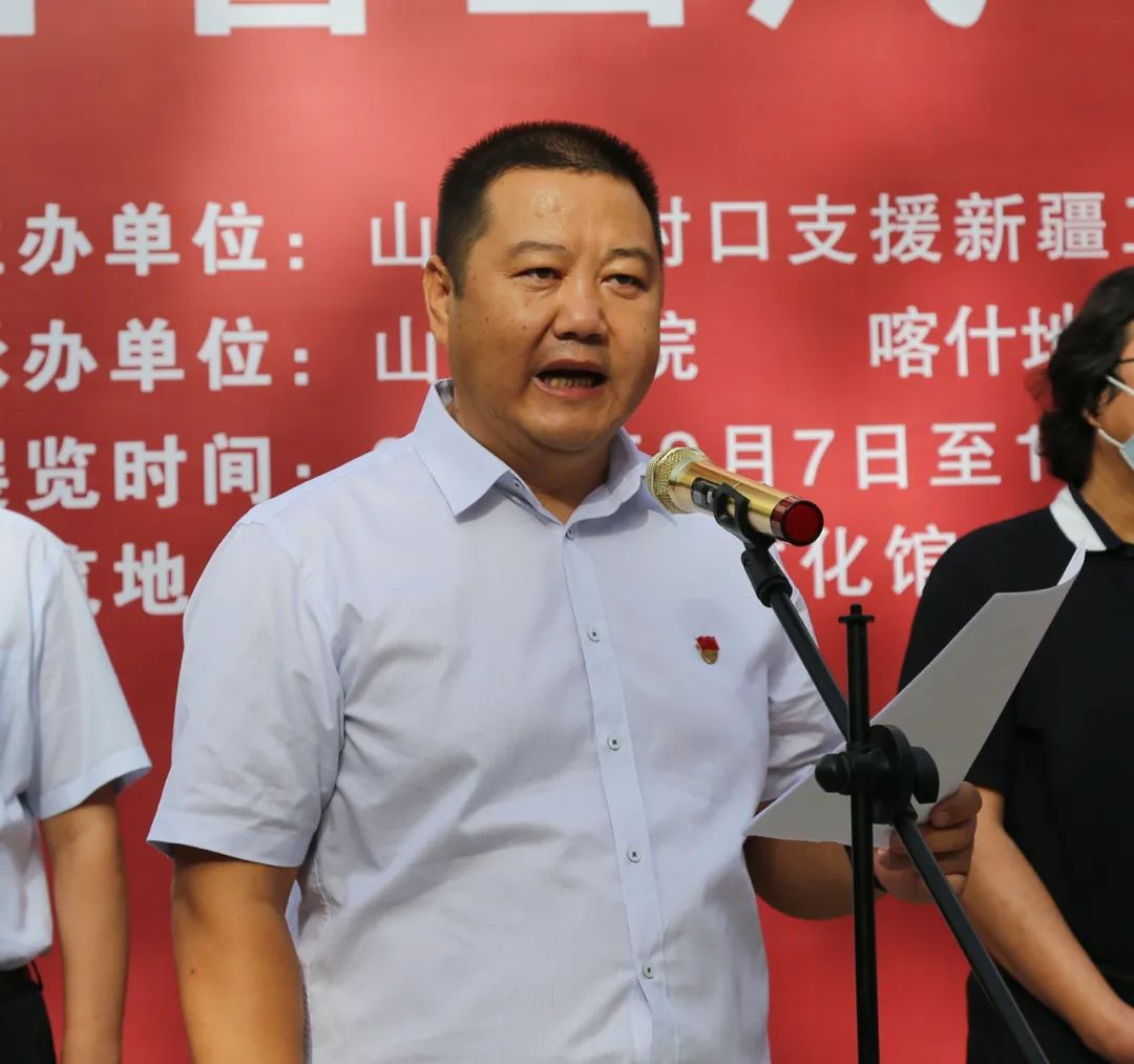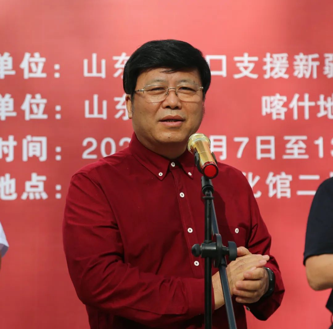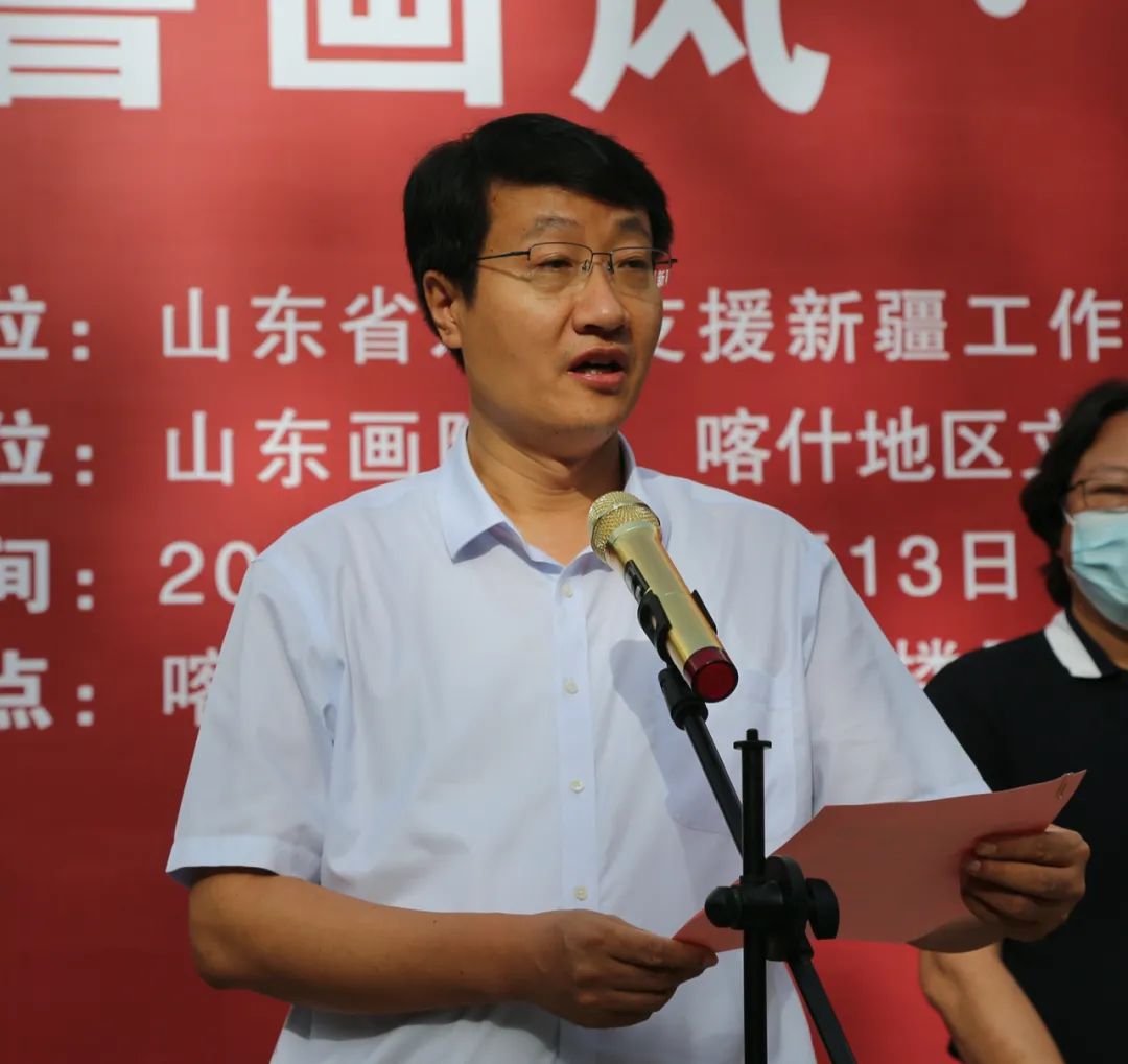 开幕式上,邓泽宇书记致辞,他谈到:“对口支援新疆是党中央交给山东的重大政治任务,目前已经第十批,推动两地交往交流交融是做好援疆工作的重要一环,开展“山东画家喀什行”活动是增进两地友谊友情友好的有效举措。山东省委、省政府对文化润疆工作高度重视,省委刘家义书记亲自安排部署,各地区部门全力推动,文化润疆工作取得丰硕成果。今年5月份,山东省文化和旅游厅王磊厅长来到喀什,主动对接文化旅游对口支援工作并签订战略合作协议,文化润疆和旅游援疆工作进入新阶段,走上了快车道。”
