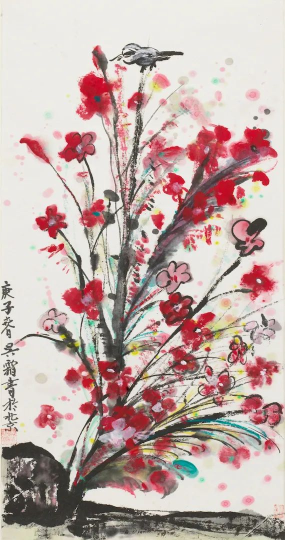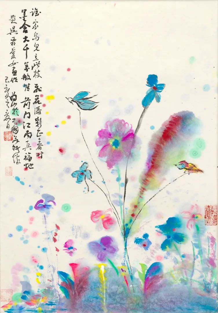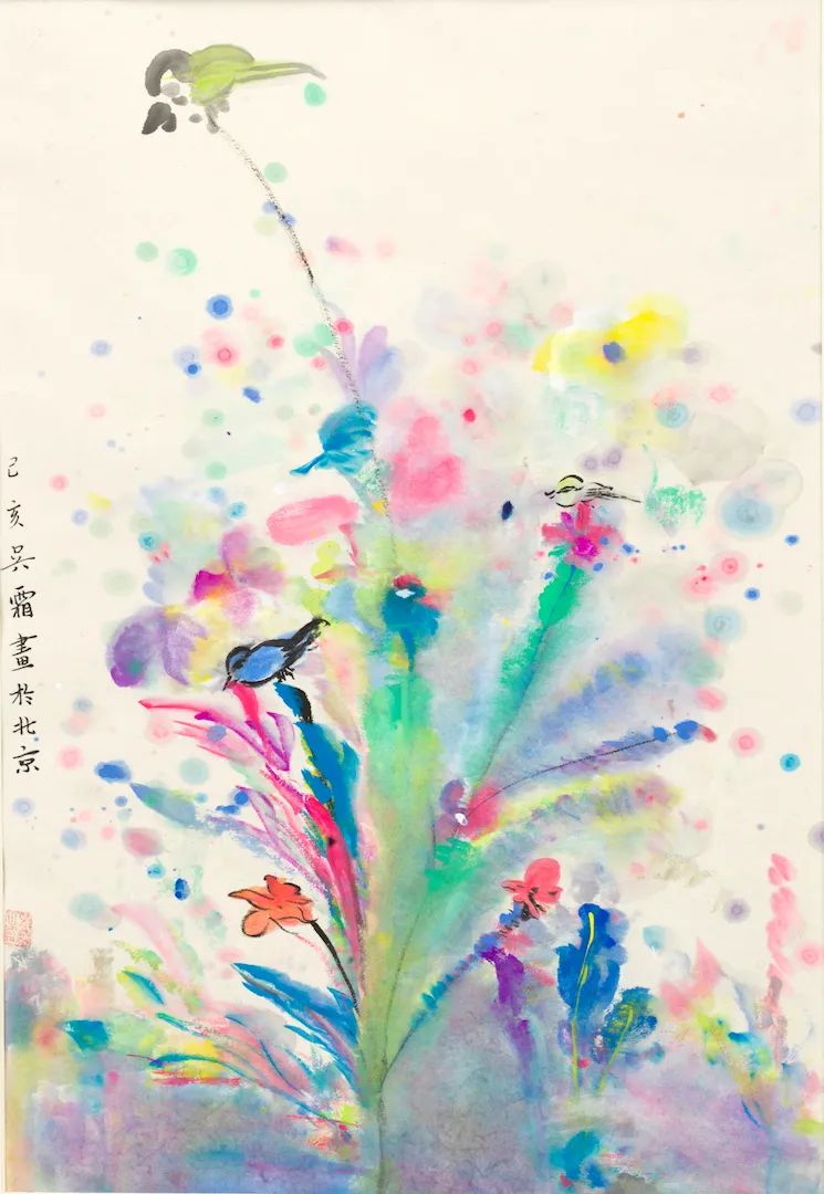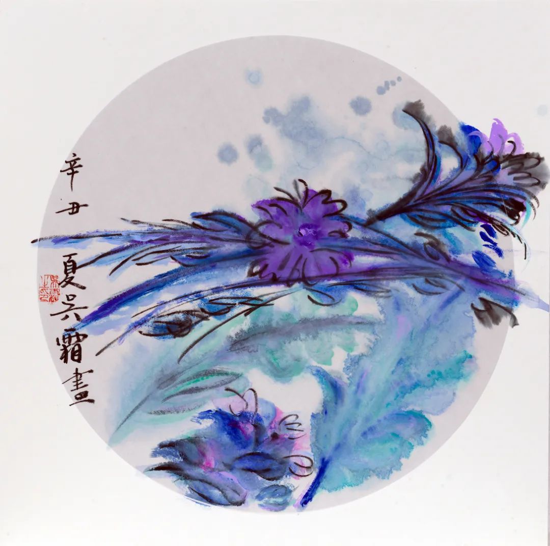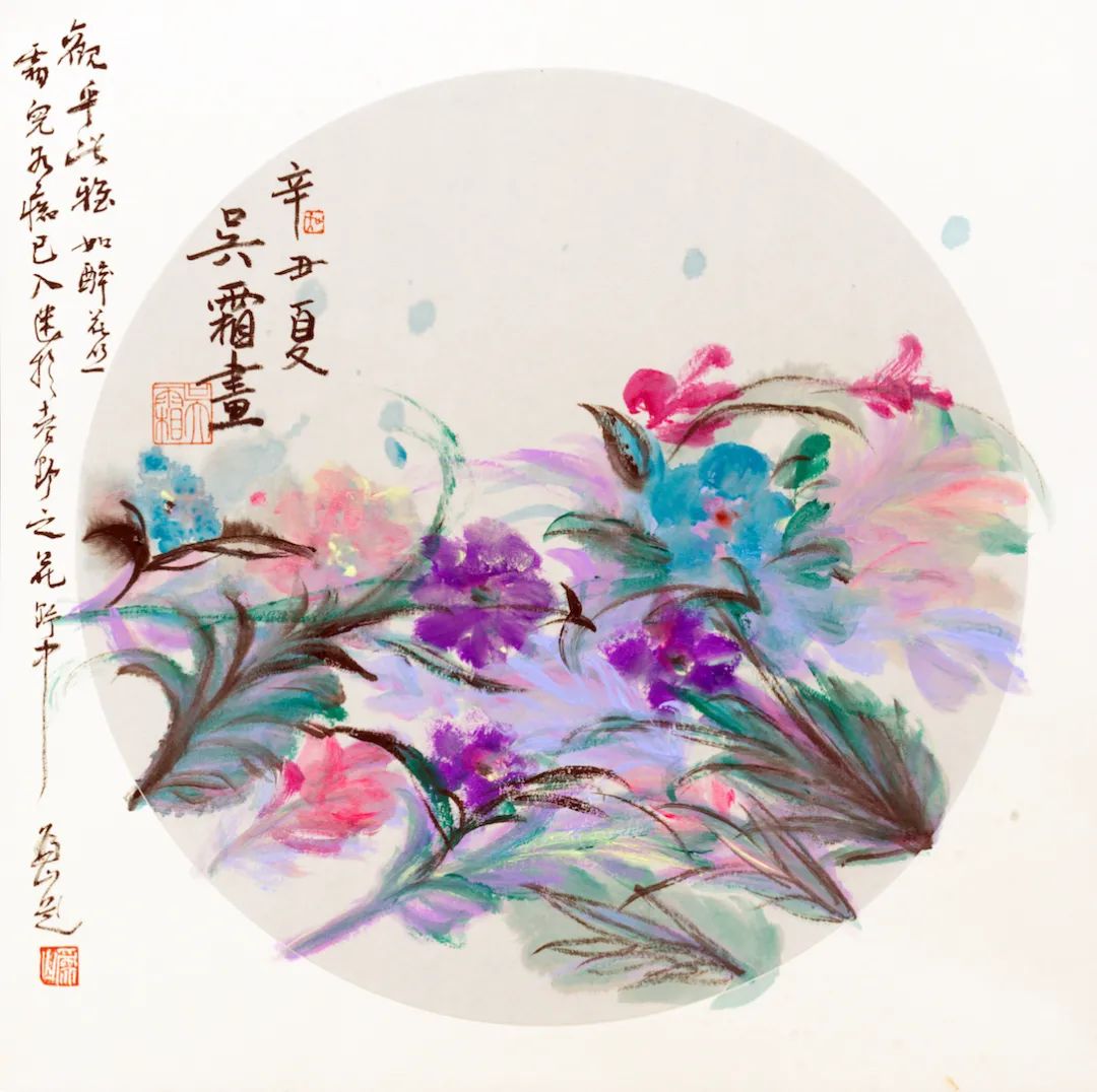花的主题,自然而然成为她连接艺术和现实的重要媒介。吴霜并不是为了画花而画,相反,却可以说是因画得“花”。她的很多作品的形象是花,有红有蓝,或含苞待放,或缤纷绚烂,却有着明显的个人风格。正如吴为山评价:“她画花与一般传统意义上的画不一样,她的画看不出哪是牡丹、月季,哪是菊花、海棠,她的花是自己心中的花,是综合了多种花的特点而‘意造’的。”吴霜将自然之花、艺术之花和心灵之花融合为画中之花。在她笔下,画儿各有其名字、花样和生命形态。可以说,吴霜赋予花新的形式美的同时,也通过花探索和创造着她自己的绘画语言。