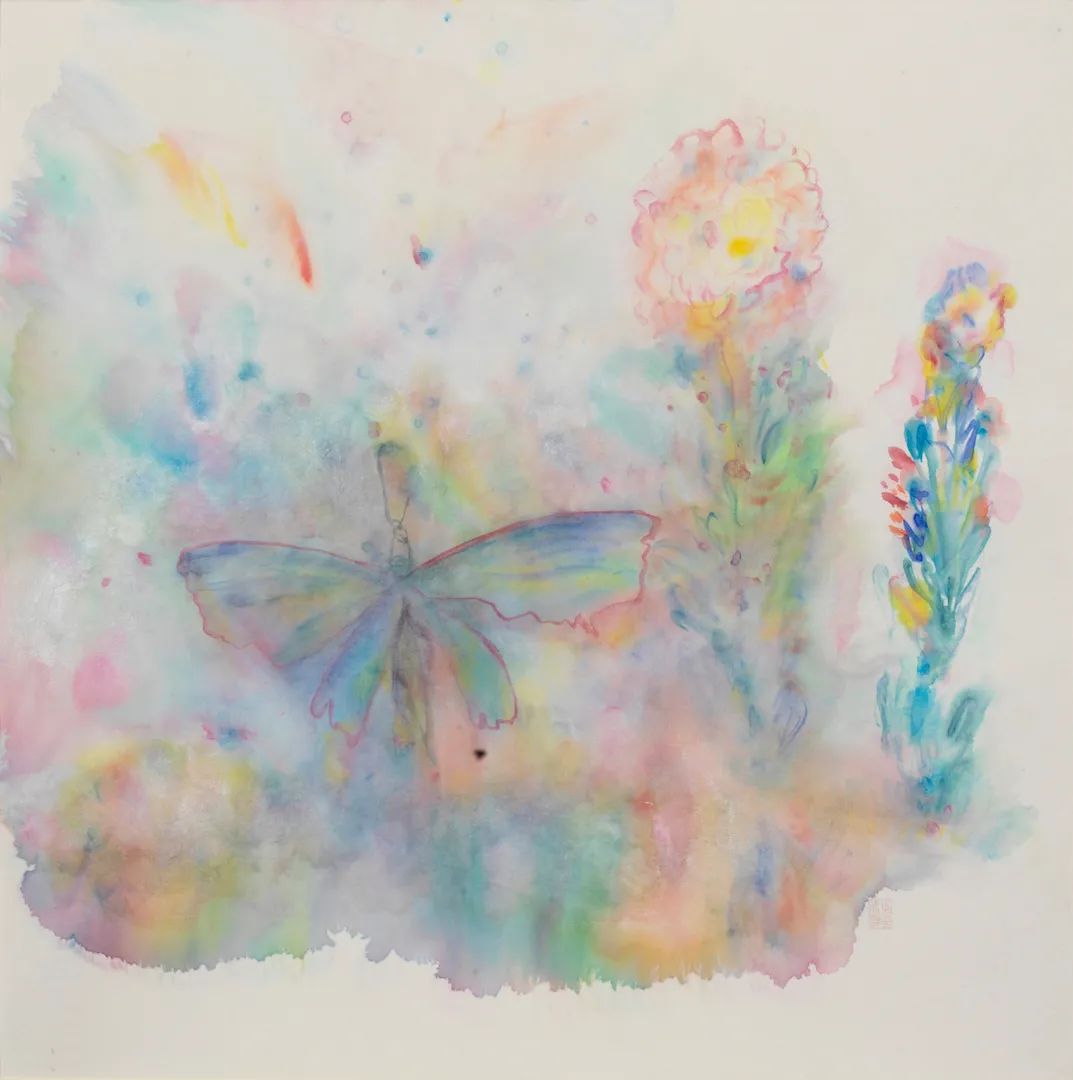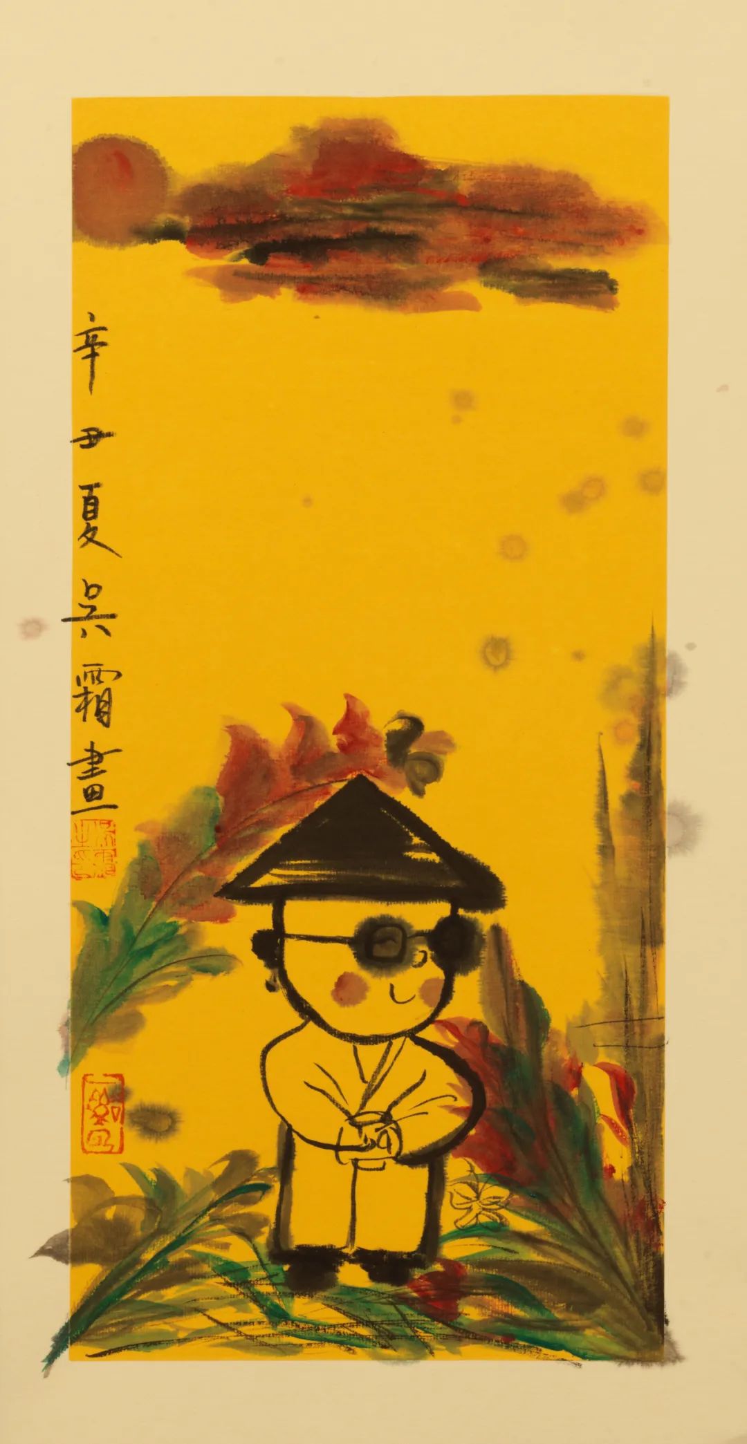 此次展出的绘画作品分为“花恋”“寻梦”和“禅心”三个主题,是吴霜对花主题的又一次拓展和再创。《嗅花》《闲》《萌萌哒》以及《唱歌的鸟》等作品中,怜爱的小和尚形象,憨厚可掬,静开的花儿,闻歌微动,宛如眼前。在看似简单、随意的彩、墨挥洒中,在诙谐的形象塑造和表现过程中,愈显画家对彩墨、点线、造型等艺术语言的把握和掌控能力,更饱含了她对自然、生命和人生的感恩和敬畏。