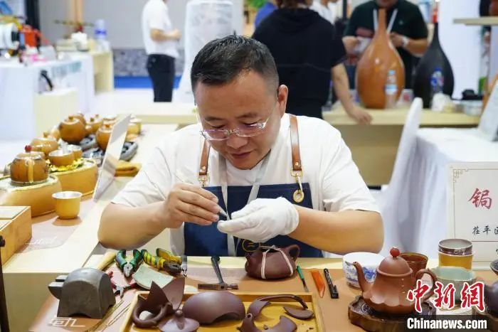 “这套茶具名为‘镶银葫芦茶具’,是融合锔瓷工艺制作的独特文创产品。”来自聊城市茌平区的锔瓷技艺代表性传承人张保洋说,所谓锔瓷,就是用金刚钻和锔钉修补破碎的瓷器,是一项兼具实用价值与艺术价值的传统手艺。“我们通过打造精巧的文创产品、开设锔瓷课程等,让更多人了解这门手艺,也想借这个展会进一步推广锔瓷技艺。”