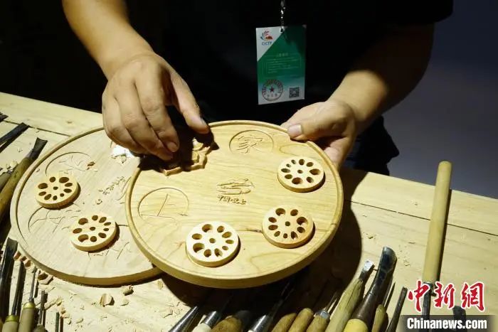 “山东手造”荟萃文旅盛会,尽显传统工艺魅力。图为木雕作品“荷之韵茶盘”。王采怡 摄