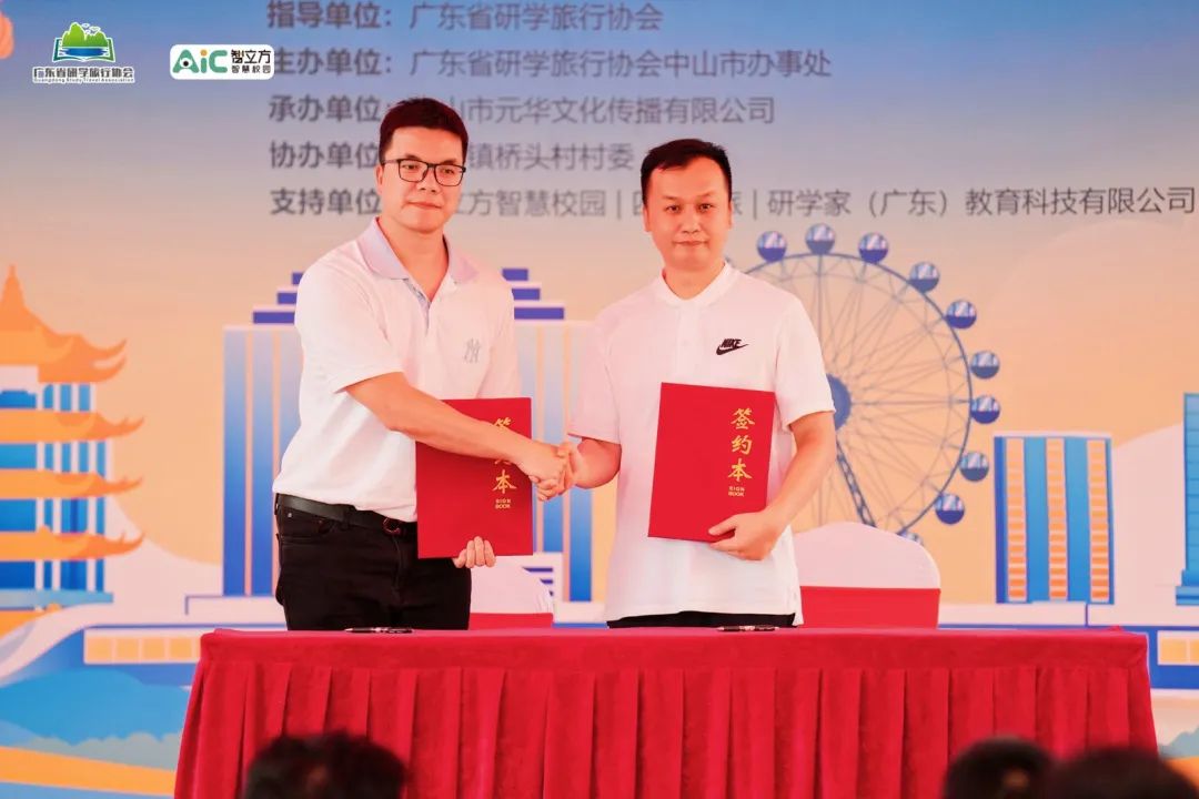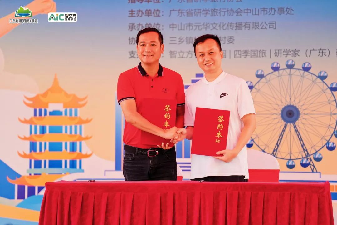 三乡镇副镇长余良盛和广东省研学旅行协会副秘书长黄汉祥为广东省研学旅行协会中山市办事处共同揭牌。 随后,广东省研学旅行协会中山市办事处代表分别与智立方智慧校园总经理刘子畅及四季国旅董事长陈仲霖签订了协议。 ▲ 智立方智慧校园总经理 刘子畅 智立方智慧校园总经理刘子畅表明了决心:智立方智慧校园平台作为广东省研学旅行协会中山市办事处的战略合作伙伴,将继续不忘初心,积极搭建“基地 - 研学从业者 - 主管部门 - 学校 - 家长 - 学生”六位一体对话桥梁,在资源整合、规范管理、课程设计、过程跟踪、结果评价等方面,提供全方位的数字化支撑和全链条解决方案,为中小学研学活动的健康发展赋能。 ▲中山市旅游推广大使、四季国旅董事长 陈仲霖 四季国旅董事长陈仲霖说出了自己对研学的理解:要规范研学活动,重视师资的培养,做到主题鲜明、内容丰富、效果突出,尤其要重视研学游的内容品质,才能让学生真真正正透过研学旅行学到知识。