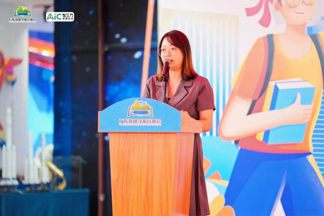 ▲ 广东省研学旅行协会副会长、中山市办事处主任 徐溢佳 广东省研学旅行协会副秘书长黄汉祥、广东省研学旅行协会副会长徐溢佳先后代表致辞,并对与会嘉宾表示衷心的感谢。他们纷纷表示:在今后的工作中,广东省研学旅行协会中山市办事处秉承“服务、创新、合作、共赢”的宗旨,坚持以学生为中心,以教育为导向,以质量为核心,不断提高服务水平和质量,为学生提供更加丰富多样的研学旅行项目。也将积极与中山市教育和体育部门、文广旅部门、社会各界合作,共同推动研学旅行事业的发展。