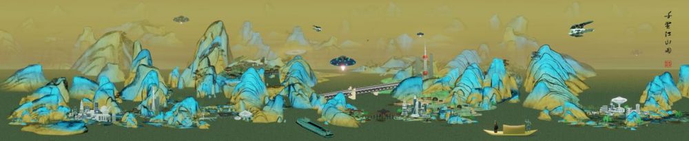 千里江山图和维特鲁威人所投射出的不同传统下的自然观和宇宙观,在原生语境中本身就寄托了王希孟和达芬奇的多重想象,构建了超出于现实之上的形而上世界。而当其与星际城市和数智构想相接续时,又凝练了通达未来的灵感可能。历史被虚拟化为现实之上的投影,在祥和生晖、万物共生的生命宇宙中搭建了一场天马行空的冥想旅途。