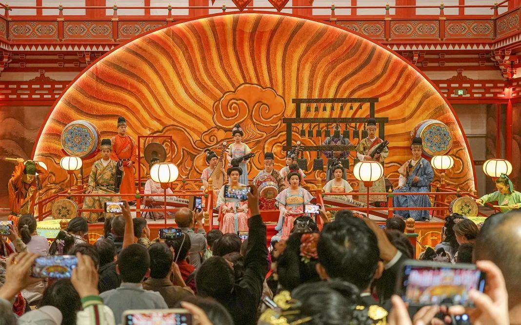 入选世界级人类非物质文化遗产代表作名录、来自1300年前的大唐交响乐——长安古乐亮相花萼相辉楼。“十二时辰古乐社”精彩演绎,高髻罗裙或身着圆领袍服的大唐乐师们,持碰铃、击座鼓、吹笙笛、敲编钟,用音乐再现盛唐气象。丝竹管弦,仙乐飘飘,每当宫廷雅乐奏起,仿佛带人步入一场大唐盛世的长安梦,余音袅袅,绕梁三日而不绝。