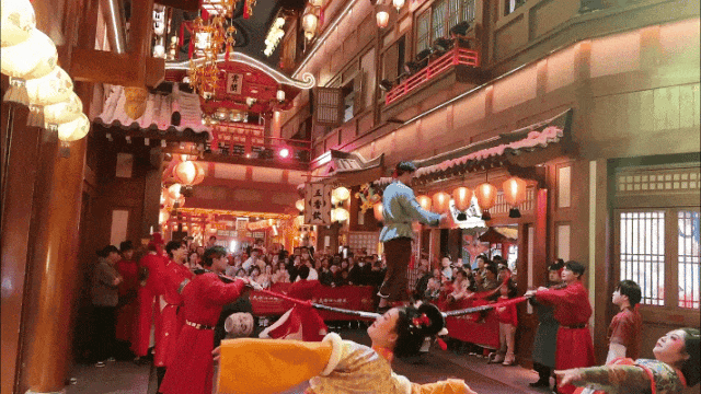 丽人街传来阵阵掌声和叫好声,是街头艺人们在展示杂技,顶缸艺人力大无穷,抖杠演出惊险刺激,市民游客直呼“精彩”,白鹤公子和红枭公子一温婉一潇洒,舞姿如梦似幻,令人沉醉其中。