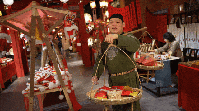 人群中此起彼伏的叫卖声引起了小文的注意。走街串巷的游商们,没有固定“驻扎”地点,他们最熟悉长安城的每一条街巷,也最了解城中的各种奇闻轶事。看似不起眼,又浑身是“戏”。他们的担子就是长安城中行走的美食“百宝箱”!
