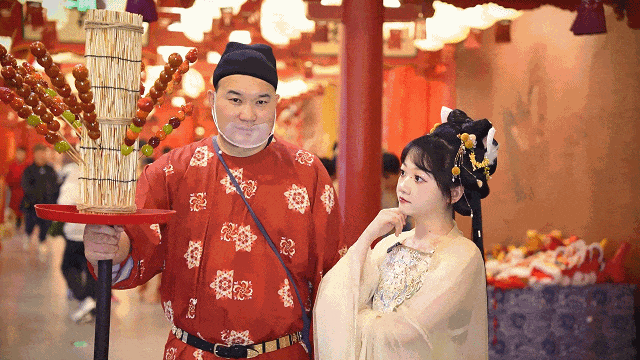热情叫卖的“葫芦哥”手中酸酸甜甜的糖葫芦让人无法拒绝!山楂、草莓、葡萄等新鲜水果裹上晶莹透亮的糖衣,现做现卖,不仅美味,也是格外好看的拍照道具哦~